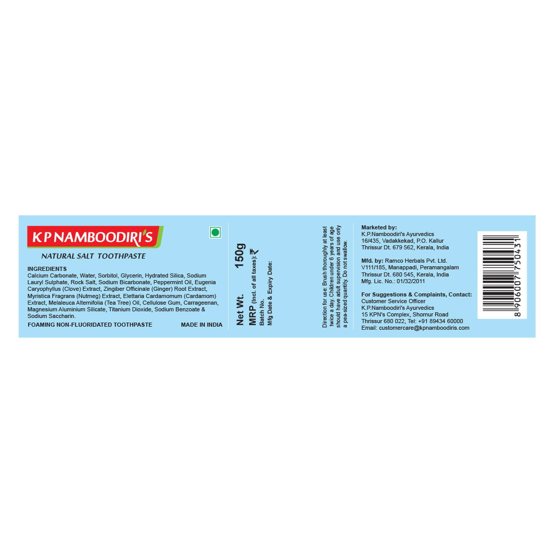 At K P Namboodiri's Ayurvedics, we believe in the power of natural care and prevention. Our Natural Salt Toothpaste combines the unique benefits of Natural Salt (Rock Salt/Induppu) and herbal actives. These ingredients work together to protect tooth enamel, maintain healthy gums and teeth, and prevent plaque formation. The natural ingredients in the Herbal Actives provide long-lasting fresh breath, while Rock Salt effectively cleanses teeth, offering strong, white teeth. This fluoride-free toothpaste is suitable for all, providing a natural way of oral protection.
